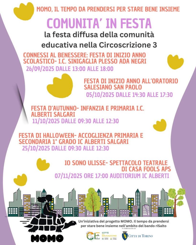 Comunità in festa è una delle azioni promosse da Momo, il tempo da prendersi per stare bene insieme, sostenuto da Fondazione Compagnia di San Paolo nella cornice di Città dell’Educazione con la Città di Torino nell’ambito del bando riSalto. E sono in partenza tante altre attività innovative per arricchire il tempo extrascolastico di bambini e bambine, ragazze e ragazzi delle scuole del 1* ciclo. Stay tuned!
